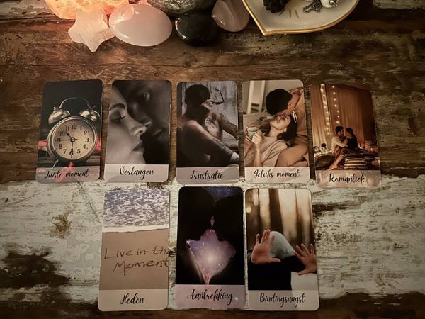 Ik leg kaartjes op een vraag die je hebt. Via whatsapp stuur ik je een foto van de kaartjes en ik spreek een bericht in, waarin ik uitleg hoe ik de kaarten lees en wat ze zeggen.
